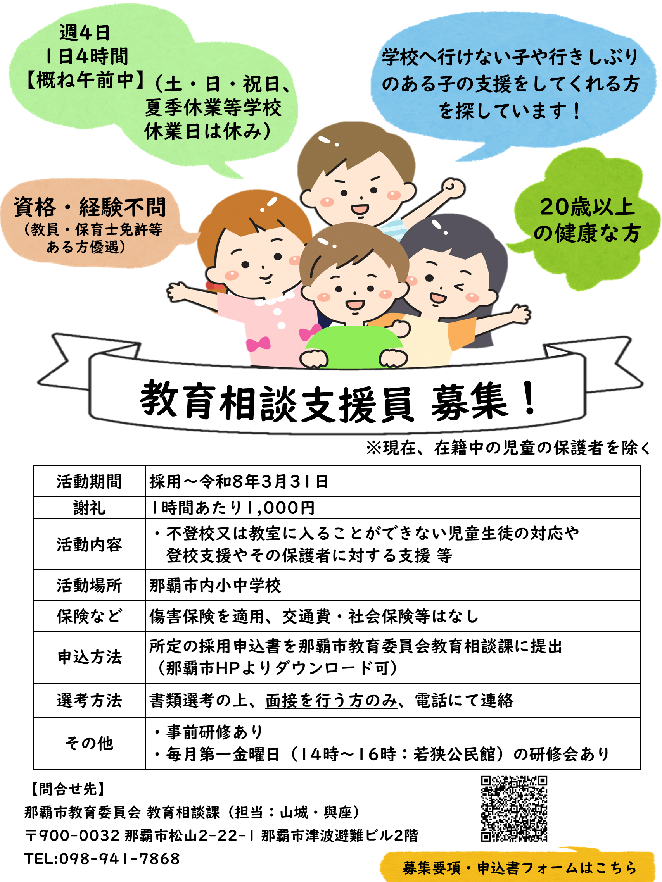 教育相談課では、令和7年度那覇市立小中学校で「不登校及び不登校傾向のある児童生徒」の支援を行う教育相談支援員を、下記のとおり募集しております。