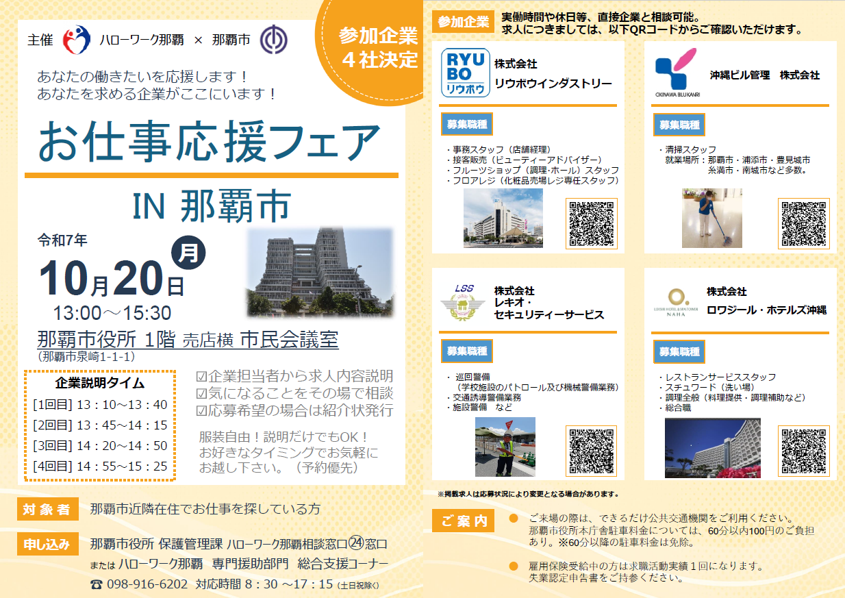 那覇市が那覇市雇用対策協定に基づき、那覇公共職業安定所と共催で行う合同企業説明会です。