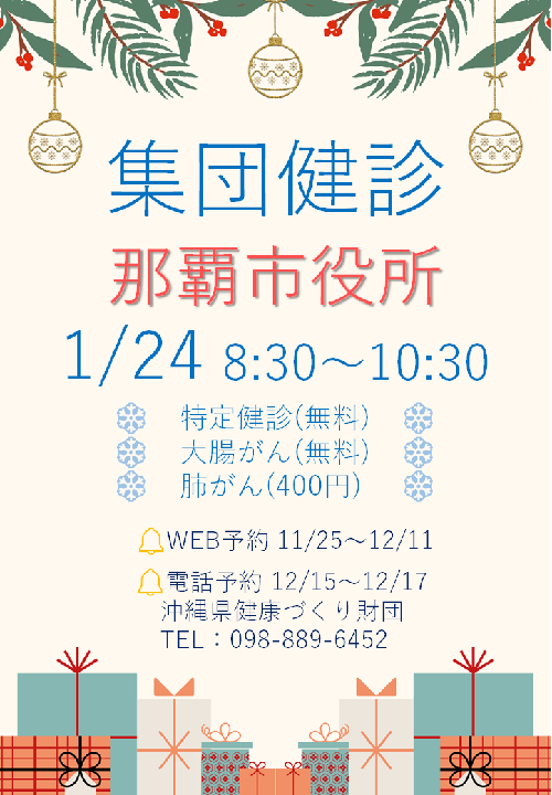 電話予約 :健康づくり財団(TEL:098-889-6474) 12/15~12/17(8時半~12時・13時~16時)
