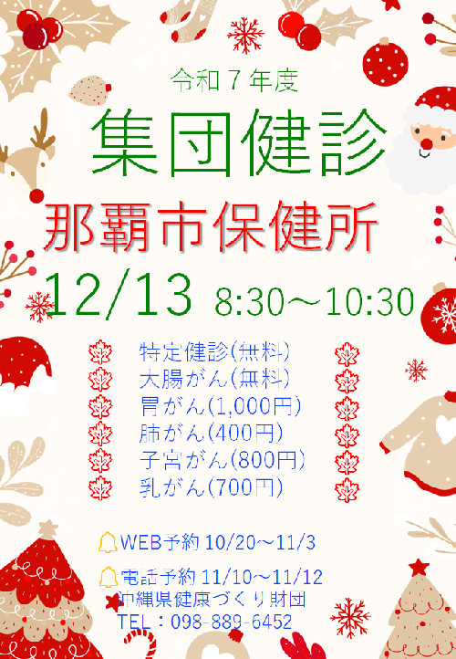 電話予約 :健康づくり財団(TEL:098-889-6474) 11/10~11/12(8時半~12時・13時~16時)
