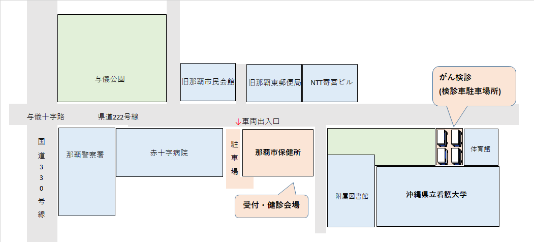 保健所内での受付や、その他の健診(基本健診や検体の提出)を済ませた後、県立看護大学駐車場までの移動(徒歩で3分程度)がございます。