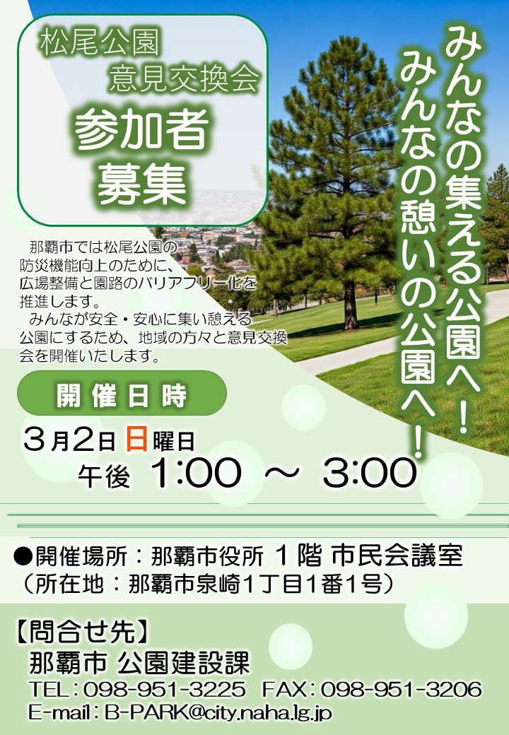 那覇市では松尾公園の防災機能向上のために、広場整備と園路のバリアフリー化を推進し、みんなが安全・安心に集い憩える公園にするため、地域の方々と意見交会を開催いたします。
