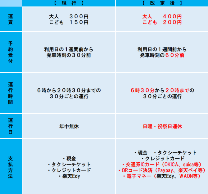 (株)鏡原第一交通が運行している真和志地域乗合タクシーについて、燃料価格や経費の高騰などを理由に、持続可能な運行に向けて、令和8年1月1日から下記のとおり運賃改定及び運行時間等の変更を実施します。