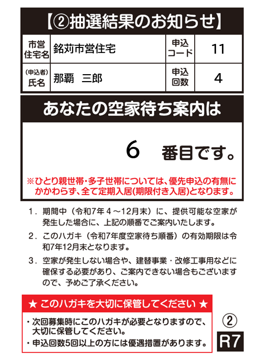 抽選結果は、3月上旬に申込全世帯へ「抽選結果のお知らせ」ハガキ(例:右図)にてお知らせしますので案内順番をご確認ください。