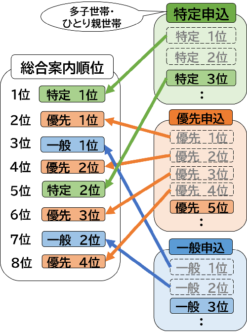 抽選によって決まった一般申込、優先申込、特定目的入居(多子世帯優先・ひとり親優先)申込毎の順位を入居の際には、「特定目的1位」→「優先1位」→「一般1位」→「優先2位」→「特定目的2位」→「優先3位」→「一般2位」→「優先4位」の順序を繰り返して案内します。