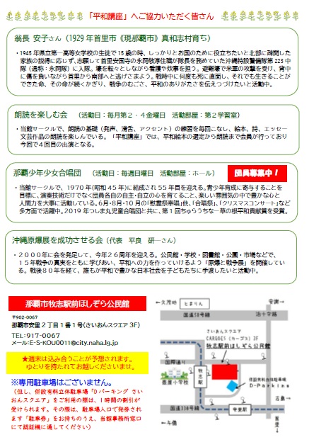 戦後81年を迎えました。年々沖縄戦を語る高齢者も少なくなりました。この機会に、戦争のむごさ・悲惨さ・戦争の本質などを学び「平和のありがたさ」について、一緒に考えてみませんか。