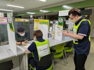 調査当日は、ビブスを着用した被験者がハイサイ市民課の窓口で手続きを行い、その様子を記録・撮影します。