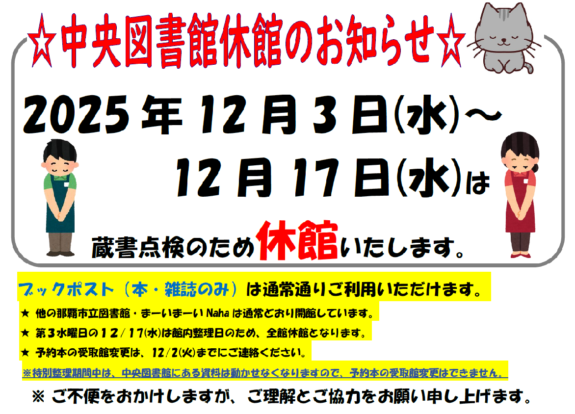 ※中央図書館以外の那覇市立図書館・まーいまーいNahaは通常通りご利用いただけます。