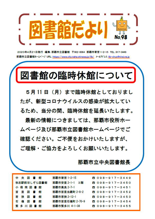 つきましては、毎月、各館より発行している図書館だよりも、臨時休館に伴い発行を休止いたします。