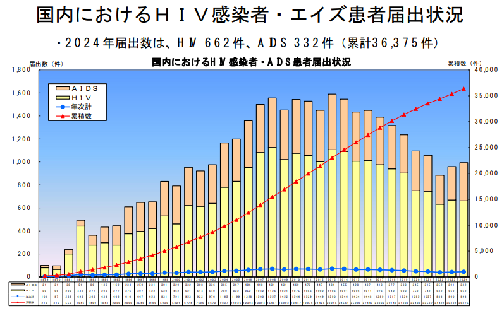 2024年の国内におけるHIV感染者の届出数は662件、エイズ患者の届出数は332件で、累計36,375件でした。