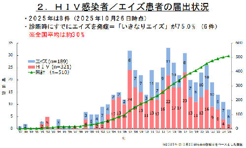 昭和62(1987)年から令和7(2025)年10月下旬までの累計は510件でした(HIV感染者321件・エイズ患者189件)。