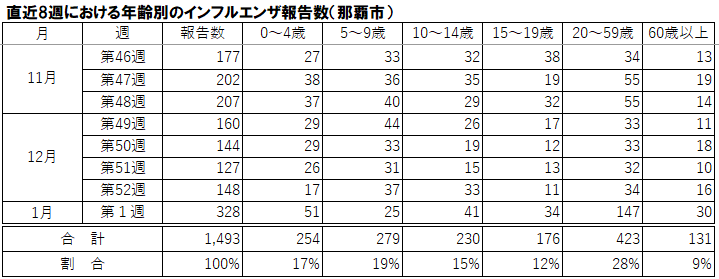 - 那覇市における第1週のインフルエンザ型別内訳は、A型133人、B型4人、臨床診断・型不明191人となっています