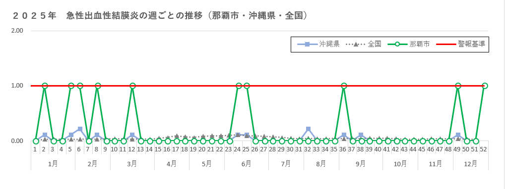 - 第52週の定点あたりの報告数は1.00となり、警報レベルの基準値である1.0に達しましたので、急性出血性結膜炎警報を発令しました。