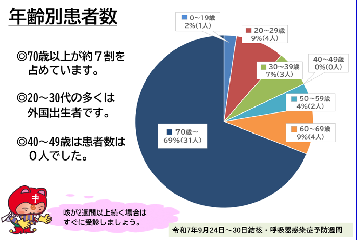 こうした状況により、わが国では毎年9月24日から9月30日を「結核・呼吸器感染症予防週間」として、結核や呼吸器感染症の予防に関する普及啓発を行っています。