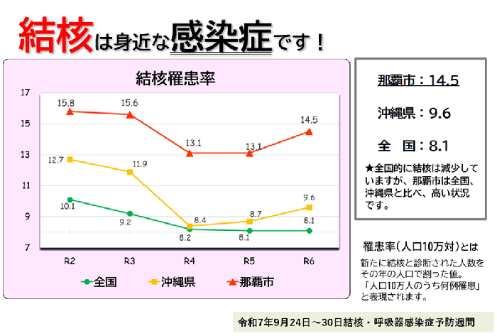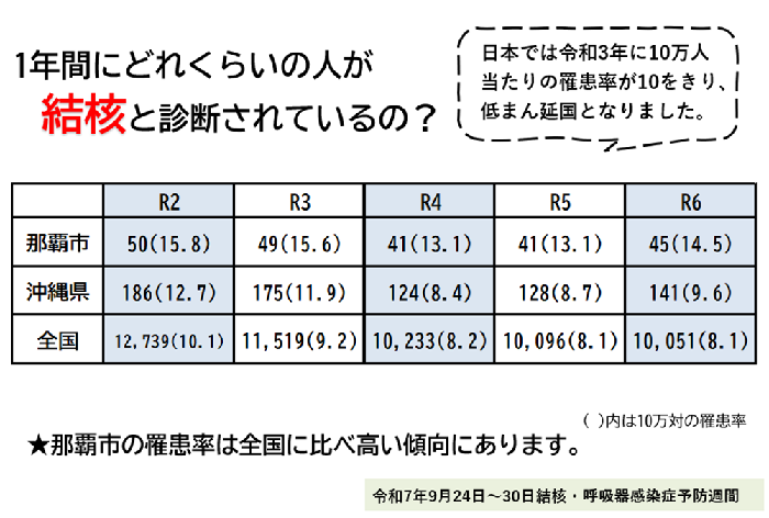 結核は、今でも年間10,000人以上の新しい患者が発生し、1,400人以上が命を落としている日本の主要な感染症です。令和6年に、日本国内で新たに10,051人、那覇市では45人の結核患者の届出がありました。