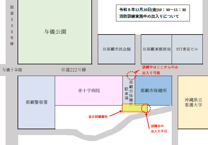 加えて、訓練実施時には那覇市保健所駐車場が避難場所となりますので、駐車場の一部を封鎖いたします。
