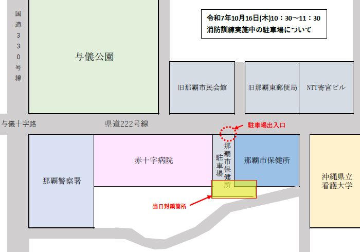 ・加えて、訓練実施時には那覇市保健所駐車場が避難場所となりますので、駐車場の一部を封鎖いたします。