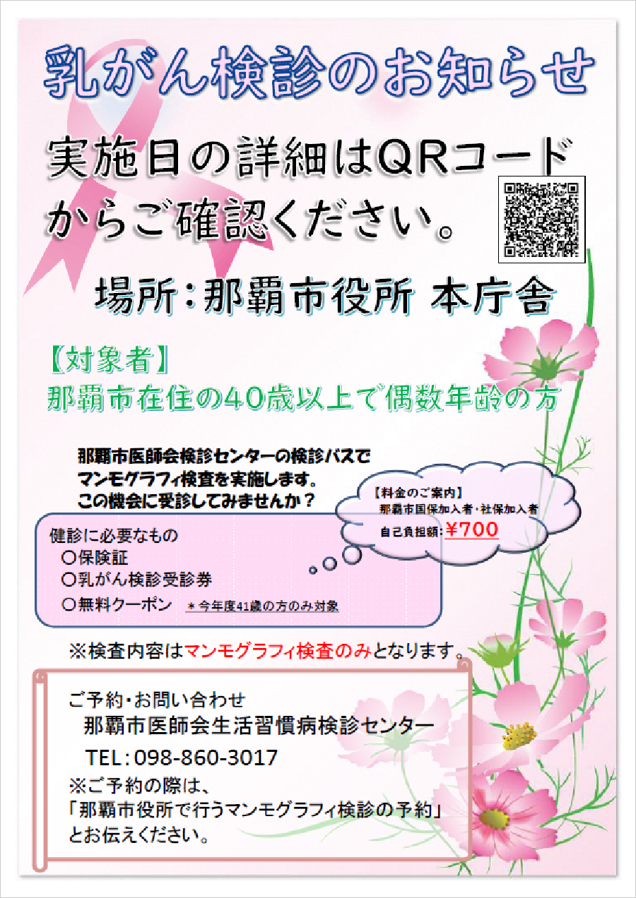那覇市医師会生活習慣病検診センターより乳がん検診のお知らせ