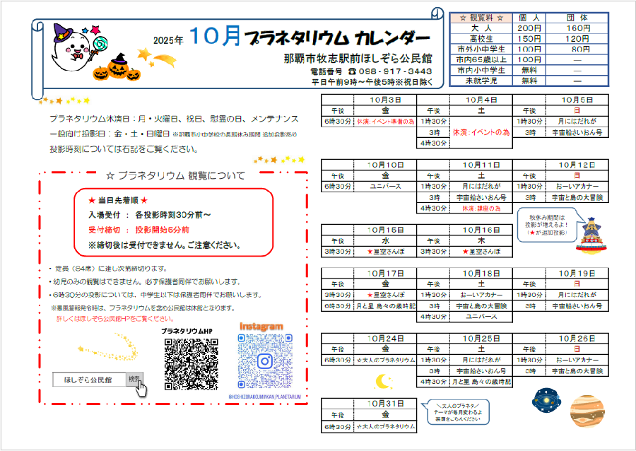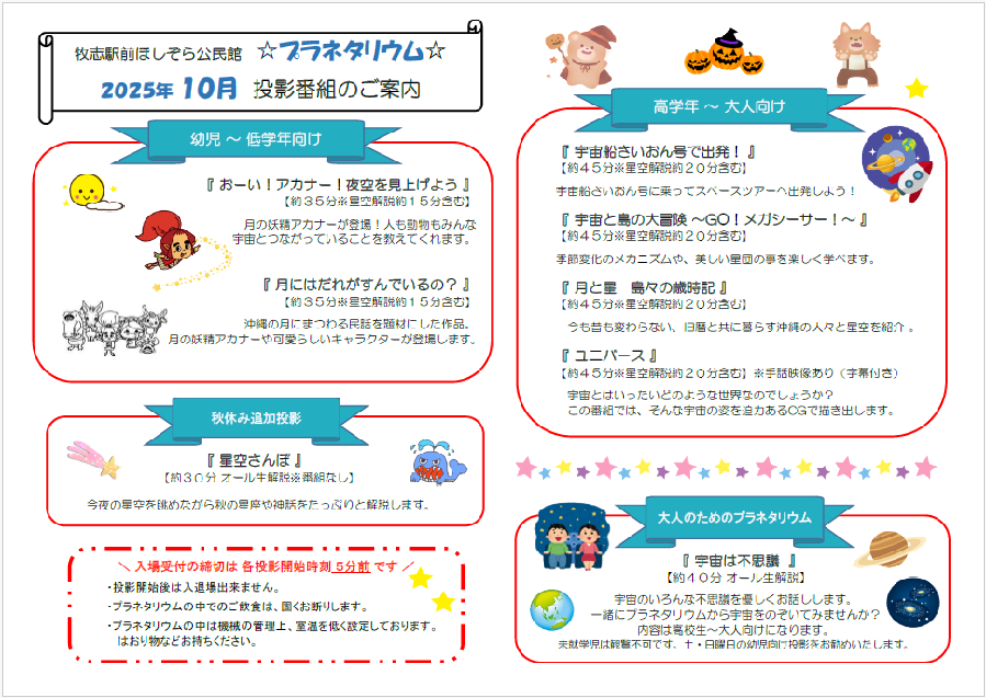 10月プラネタリウム一般向け投影カレンダー