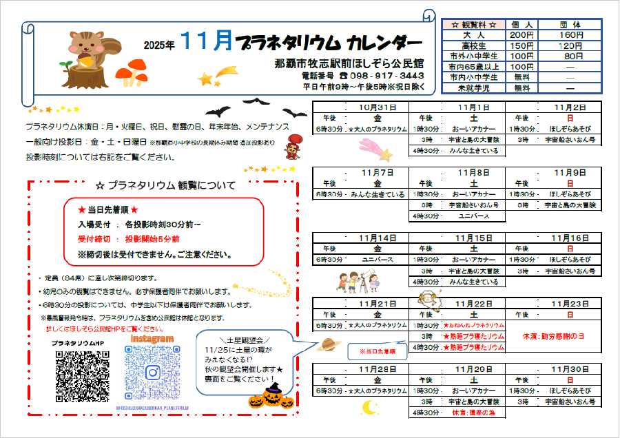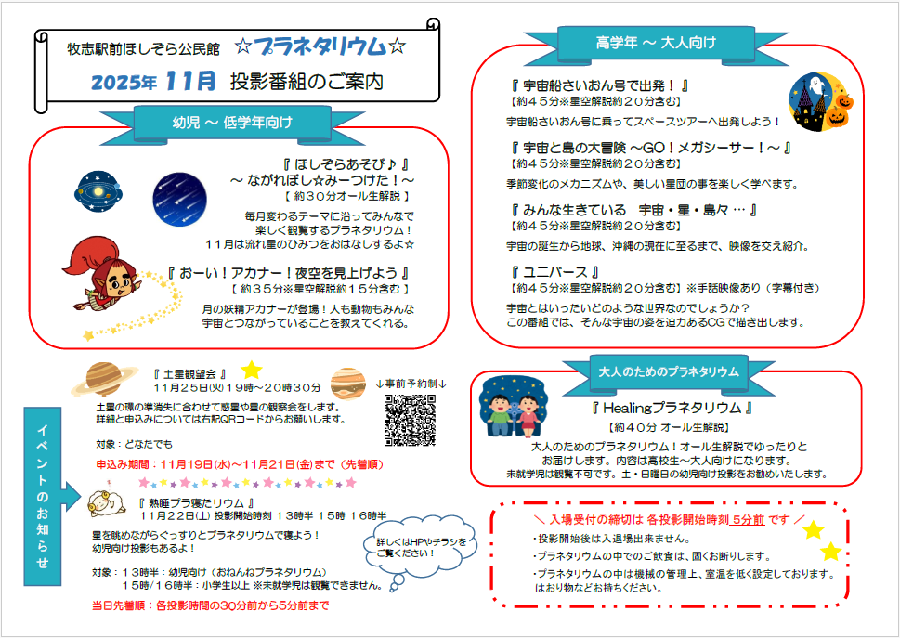 NEW!! 11月プラネタリウム一般向け投影カレンダー