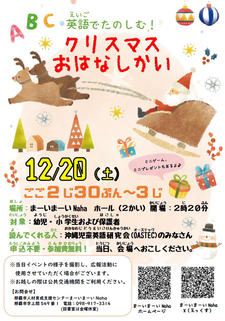 那覇市人材育成支援センターまーいまーいNaha図書室では、季節や行事に合わせて年に数回、特別おはなし会などのイベントを開催しています。